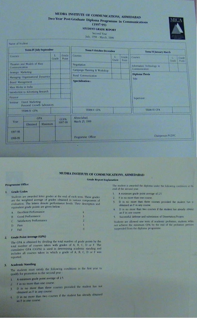 Student Grade Report, Post-Graduate Diploma Programme in Communications (PGDPC), Batch 1997-1999